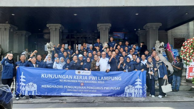 MOMENTUM, Solo – Persatuan Wartawan Indonesia (PWI) Provinsi Lampung hadir dengan kekuatan penuh dalam pelantikan pengurus PWI Pusat periode 2025–2030 di Kota Solo, Jawa Tengah, Sabtu 4 Oktober 2025.