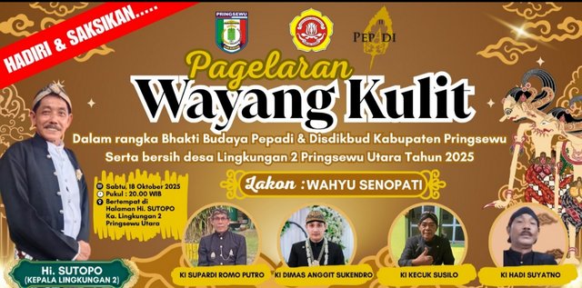 “Pada malam harinya, mulai pukul 21.00 WIB, digelar pagelaran wayang kulit semalam suntuk dengan lakon Wahyu Senopati. Pagelaran ini menghadirkan empat dalang dari Pepadi Pringsewu, yakni Ki Supardi Romo Putro, Ki Dimas Anggit Sukendro, Ki Kecuk Susilo, dan Ki Jadi Suyatno,” jelas Joko.
