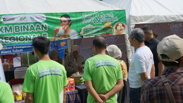 Tak heran jika panitia mengundang pedagang kecil mitra binaan yang memproduksi kuliner tradisional. Salah satunya adalah Suyanti, pedagang pecel pincuk semanggi khas Surabaya yang diserbu pembeli.