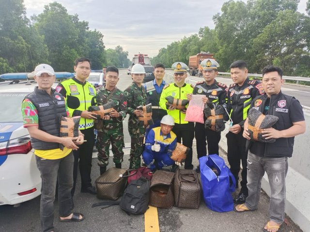 MOMENTUM, Terbanggibesar -- Puluhan ribu butir pil yang diduga ekstasi ditemukan anggota Koramil 411-11/Terbanggibesar setelah sebuah mobil SUV warna hitam mengalami kecelakaan tunggal di Jalan Tol Trans Sumatera KM 136 B, Lampung Tengah, Kamis (20-11-2025).