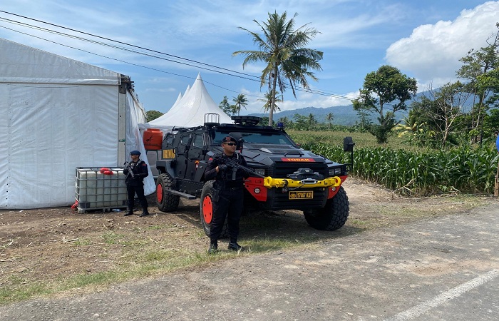 Satu SST personel Satbrimob Polda Lampung dengan Padal Iptu Fajar Fachrizi dikerahkan bersama sejumlah kendaraan taktis, antara lain mobil Raindulap Brimob, truk angkut logistik, serta unit tangki air bersih.