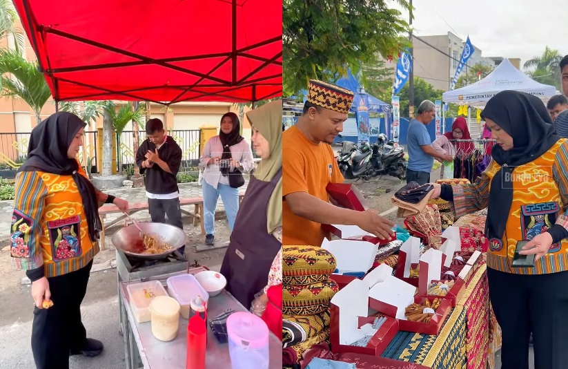 Eva Dwiana berkeliling stan kuliner, memborong sejumlah jajanan, dan berdialog dengan pedagang mengenai aktivitas usaha dan kondisi penjualan. Ia juga tampak ikut membantu memasak beberapa menu, di antaranya kebab dan mi tek-tek, bersama para pelaku UMKM.