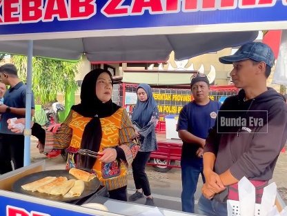 Suasana kunjungan berlangsung santai dan penuh keakraban. Eva bahkan sempat melontarkan candaan saat memasak. “Tidak apa-apa kalau gosong, bunda sendiri yang makan,” ujarnya sambil membolak-balik kebab yang disambut tawa para pedagang.
