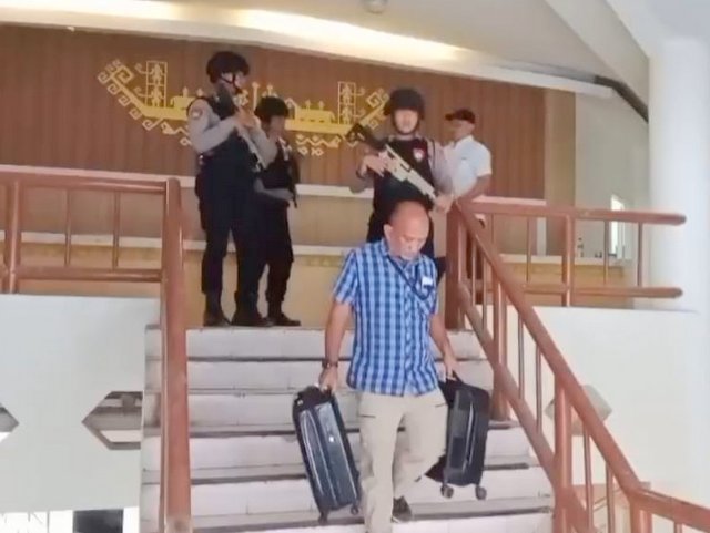 "Sabar ya, kami masih bekerja," ujar salah satu petugas sembari tersenyum kepada awak media saat mengawal penggeledahan.