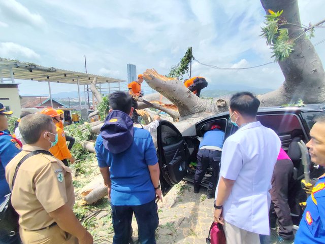 “Pohon tumbang menimpa kendaraan di area Hotel Bukit Randu. Ukuran pohon yang sangat besar membuat proses evakuasi berlangsung lama dan penuh kehati-hatian. Alhamdulillah, korban berhasil dikeluarkan sekitar pukul 13.10 WIB,” ujar Anthoni.