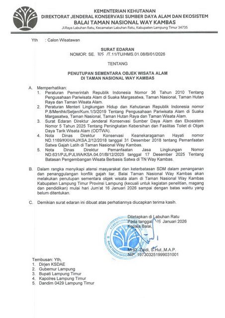 Dalam Surat Edaran bertanggal 15 Januari 2026 yang ditandatangani Kepala Balai TNWK, MHD Zaidi, disebutkan: "Penutupan mulai hari Jumat, 16 Januari 2026 sampai dengan batas waktu yang belum ditentukan".