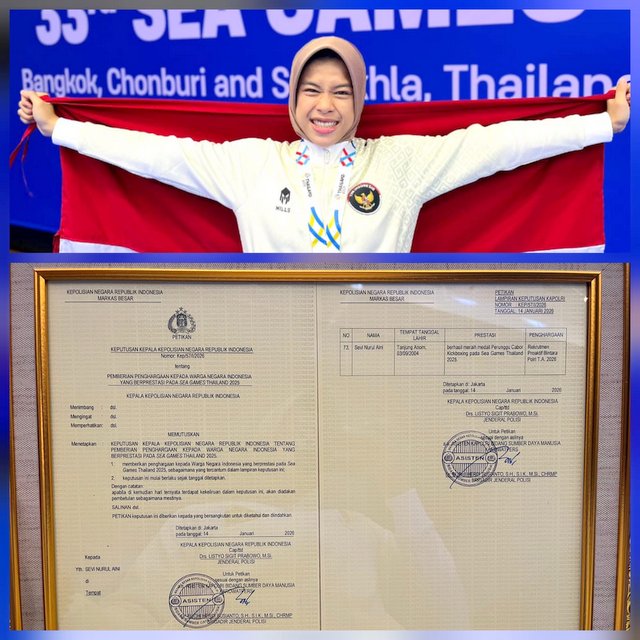 MOMENTUM, Jakarta -- Prestasi membanggakan kembali ditorehkan atlet asal Kabupaten Tanggamus Provinsi Lampung. Sevi Nurul Aini, atlet kickboxing, menerima penghargaan dari Kapolri Jenderal Polisi Listyo Sigit Prabowo atas keberhasilannya meraih medali perunggu pada ajang SEA Games 2025 Thailand.