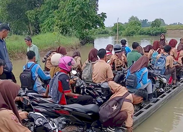 MOMENTUM, Bandarlampung--Sebuah video yang memperlihatkan perahu bermuatan pelajar dan sepeda motor menyeberangi sungai di Desa Kalipasir, Kecamatan Waybungur, Kabupaten Lampung Timur, beredar luas di media sosial dan menarik perhatian publik.
