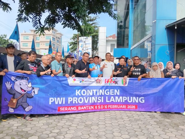 Pelepasan berlangsung di Balai Wartawan H Solfian Akhmad, Bandarlampung, Jumat (6/2/2026). Ratusan wartawan tersebut terdiri anggota dan pengurus PWI dari provinsi, kabupaten dan kota di Lampung.