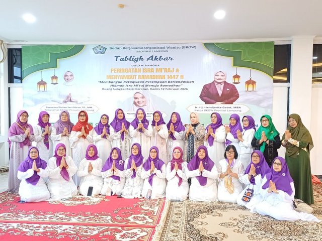 Seperti halnya hari ini, Kamis (12-2-2026), BKOW Provinsi Lampung sukses menggelar Tabligh Akbar dalam rangka memperingati Isra Miraj Nabi Muhammad SAW sekaligus menyongsong datangnya bulan suci Ramadan, dilaksanakan di Ruang Sungkai Balai Keratun Komplek Pemerintah Provinsi Lampung.