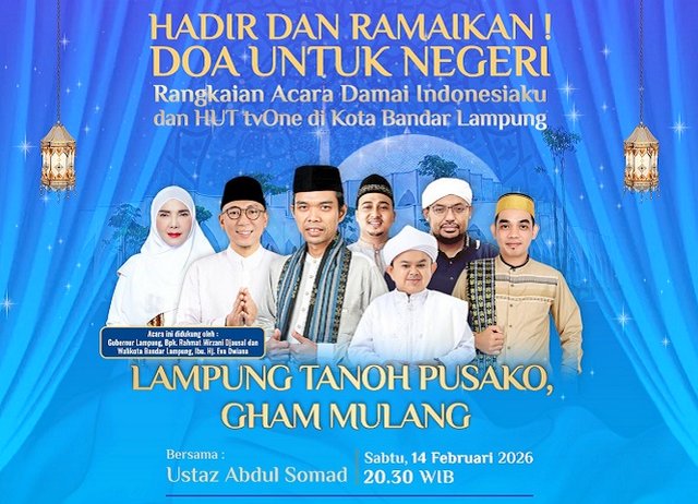 MOMENTUM, Bandarlampung -- Program religi nasional “Doa untuk Negeri” dari tvOne akan digelar di Provinsi Lampung pada 14–15 Februari 2026.