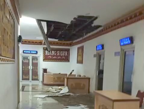 MOMENTUM, Kotabumi -- Angin kencang disertai hujan deras menyebabkan kerusakan di Kantor Pemerintah Daerah Kabupaten Lampung Utara, Sabtu (14-2-2026). Sejumlah plafon di kantor pemerintah tersebut runtuh akibat terjangan angin.
