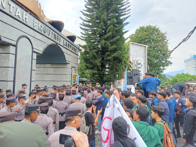 MOMENTUM, Bandarlampung--Seratusan mahasiswa masa aksi yang tergabung dalam Aliansi Lampung Melawan, menggeruduk Komplek Perkantor DPRD dan Gubernur Lampung, Senin (23-2-2026).