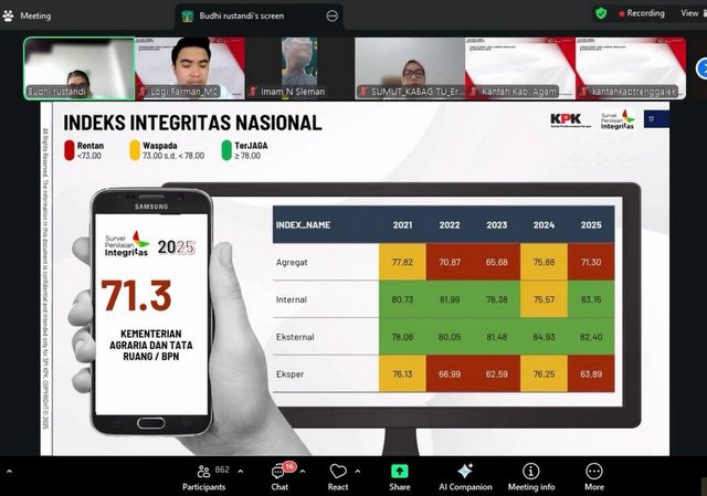 MOMENTUM, Jakarta -- Hasil Survei Penilaian Integritas (SPI) untuk Kementerian Agraria dan Tata Ruang/Badan Pertanahan Nasional (ATR/BPN) Tahun 2025 telah dirilis oleh Komisi Pemberantasan Korupsi (KPK). Indeks Integritas Nasional ATR/BPN secara agregat berada di angka 71,3.