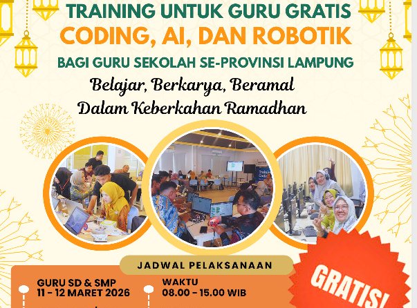 Kegiatan ini dijadwalkan berlangsung pada 9 – 10 Maret 2026 untuk guru SMA/SMK dan 11 – 12 Maret 2026 untuk guru SD/SMP. Seluruh sesi pelatihan digelar pukul 08.00–15.00 WIB di Aula Pascasarjana UBL, Bandar Lampung.