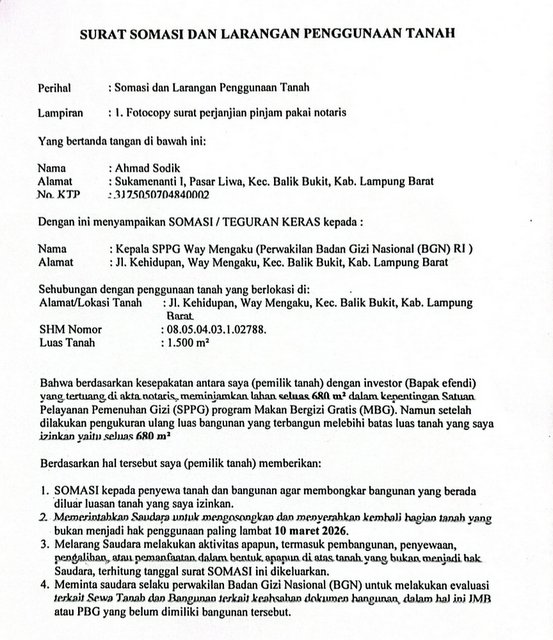 Pemilik lahan lokasi berdirinya SPPG Jl. Kehidupan Kel. Waymengaku, Ahmad Sodik saat dikonfirmasi, Jumat (27/02/26) mengatakan, surat somasi dan teguran keras telah dilayangkan oleh pihaknya ke pihak SPPG tertanggal 26 Januari 2026.