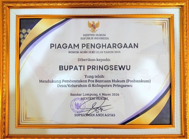 MOMENTUM, Pringsewu -- Bupati Pringsewu Riyanto Pamungkas memperoleh piagam penghargaan dari Menteri Hukum (Menkum) RI Supratman Andi Agtas, atas dukungan pembentukan Pos Bantuan Hukum (Posbankum) Desa/Kelurahan.
