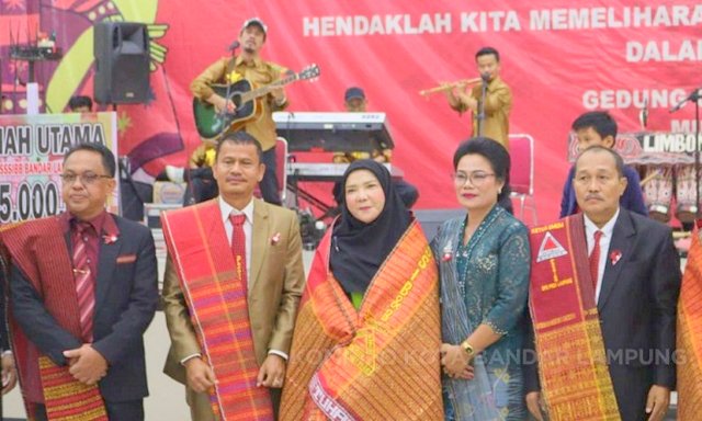 MOMENTUM, Bandarlampung -- Walikota Bandarlampung, Eva Dwiana, menghadiri kegiatan Pesta Bona Taon sekaligus pelantikan Dewan Pengurus Wilayah Parsadaan Simanjuntak Sitolu Sada Ina Dohot Boruna (SSSIDB) Kota Bandarlampung periode 2026–2030.