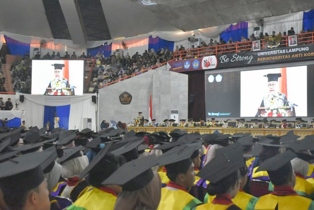 Rektor Unila, Prof Lusmeilia Afriani, menyampaikan ucapan selamat kepada para lulusan dan ucapan terima kasih serta penghargaan kepada pihak-pihak terkait atas kerja keras dan kerja sama dalam melaksanakan tugas mendidik mahasiswa.