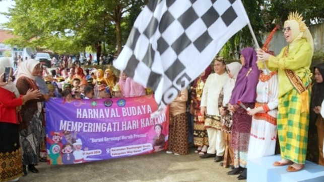 MOMENTUM, Blambanganumpu--Bupati Waykanan Ayu Asalasiyah melepas Karnaval Budaya memperingati Hari Kartini, dari halaman Kantor Kecamatan Blambanganumpu, Selasa, (21-4-20260). Karnval yang diikuti ratusan siswa-siswi PAUD itu juga menjadi rangkaian acara peringatan HUT ke 27 Kabupaten Waykanan.
