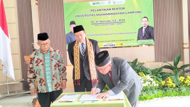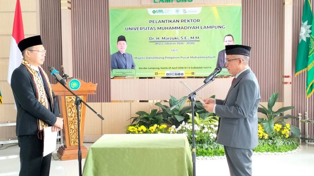 MOMENTUM, Bandarlampung -- Marzuki dilantik sebagai Rektor Universitas Muhammadiyah (UM) Lampung periode 2026–2030, menggantikan Mardiana. Pelantikan berlangsung di Gedung Hj. Siti Walidah, Kampus II UM Lampung, Sukarame, Bandarlampung, Kamis (23/4/2026).