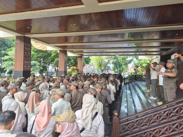 MOMENTUM, Bandarlampung--Sejumlah anggota Satuan Polisi Pamong Praja (Satpol PP) Provinsi Lampung menggelar aksi unjuk rasa di depan Kantor Gubernur Lampung, Rabu (29/4/2026). Massa menyampaikan aspirasi terkait penolakan terhadap kepemimpinan Kepala Satpol PP Lampung, M. Zulkarnain, serta mendesaknya mundur dari jabatan.